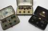 each comprising a pair of cufflinks and four graduated studs, collet set with oval and circular cut sard onyx cabochons, mounts unmarked (test as gold), contained in fitted cases (3)