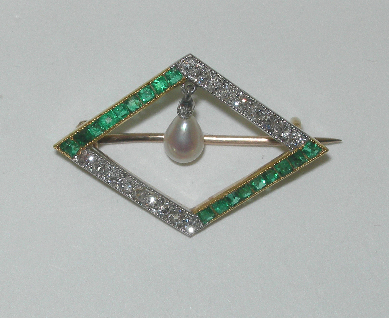 of open lozenge design, set with borders of calibre cut emeralds and single cut diamonds, with central baroque pearl drop surmounted by a millegrain collet set old European cut diamond, contained in a fitted case stamped R. STEWART GLASGOW...