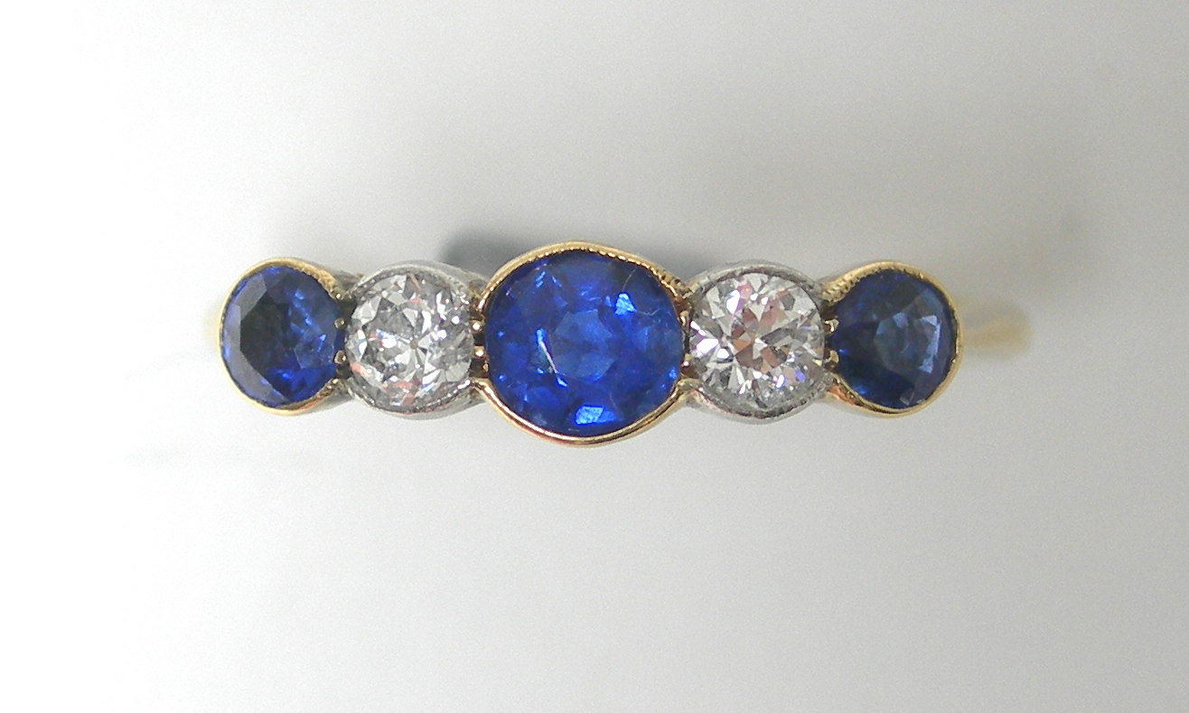 alternately collet set with graduated circular cut sapphires and old European cut diamonds