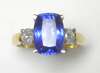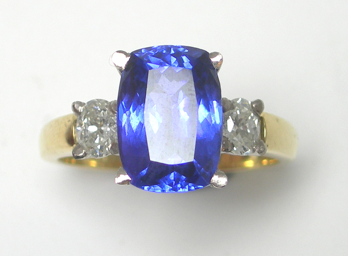 claw set to the centre with a fancy rectangular cut Tanzanite, flanked to either side by a round brilliant cut diamond