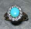 the central claw set oval cut turquoise cabochon within a surround of old European cut diamonds