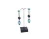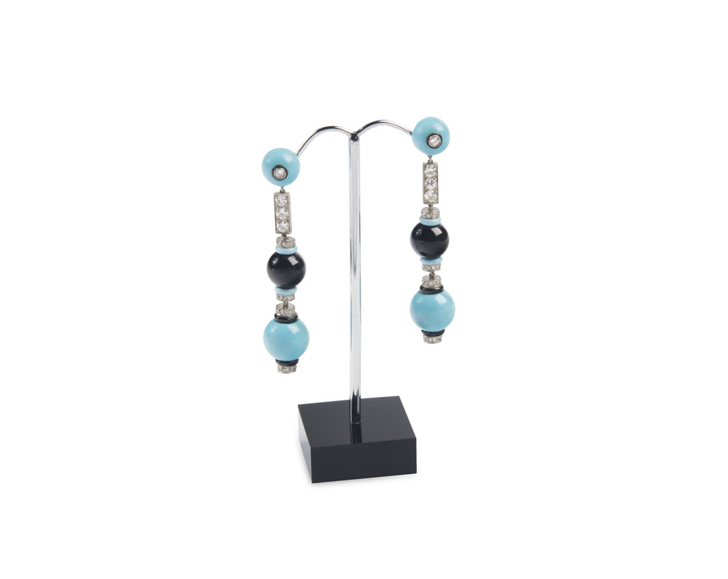 each composed of a hemispherical turquoise bead, millegrain collet set to the centre with a round brilliant cut diamond, within a black enamelled border, surmounting a rectangular link with foliate scroll decorated sides, set with three similarly cut diamonds, suspending graduated spherical onyx and turquoise bead drops, interspersed by slim onyx, turquoise and pave diamond set rondels, with post and disc fittings