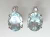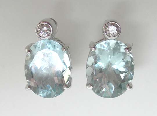 each composed of a collet set round brilliant cut diamond surmounting a claw set oval cut aquamarine drop, mounts stamped 14K