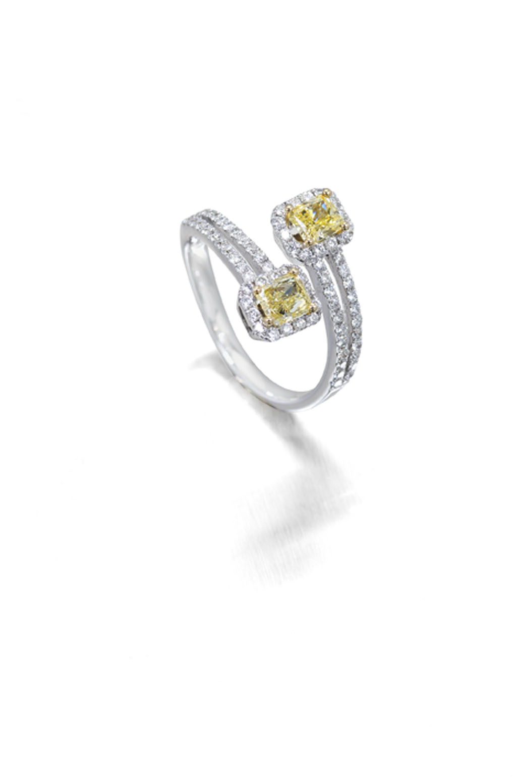 of cross-over design, composed of two rows, each pave set with round brilliant cut diamonds, terminating in a rectangular cluster, with central claw set fancy yellow trap cut diamond, within a surround of round brilliant cut diamonds, shank stamped 750