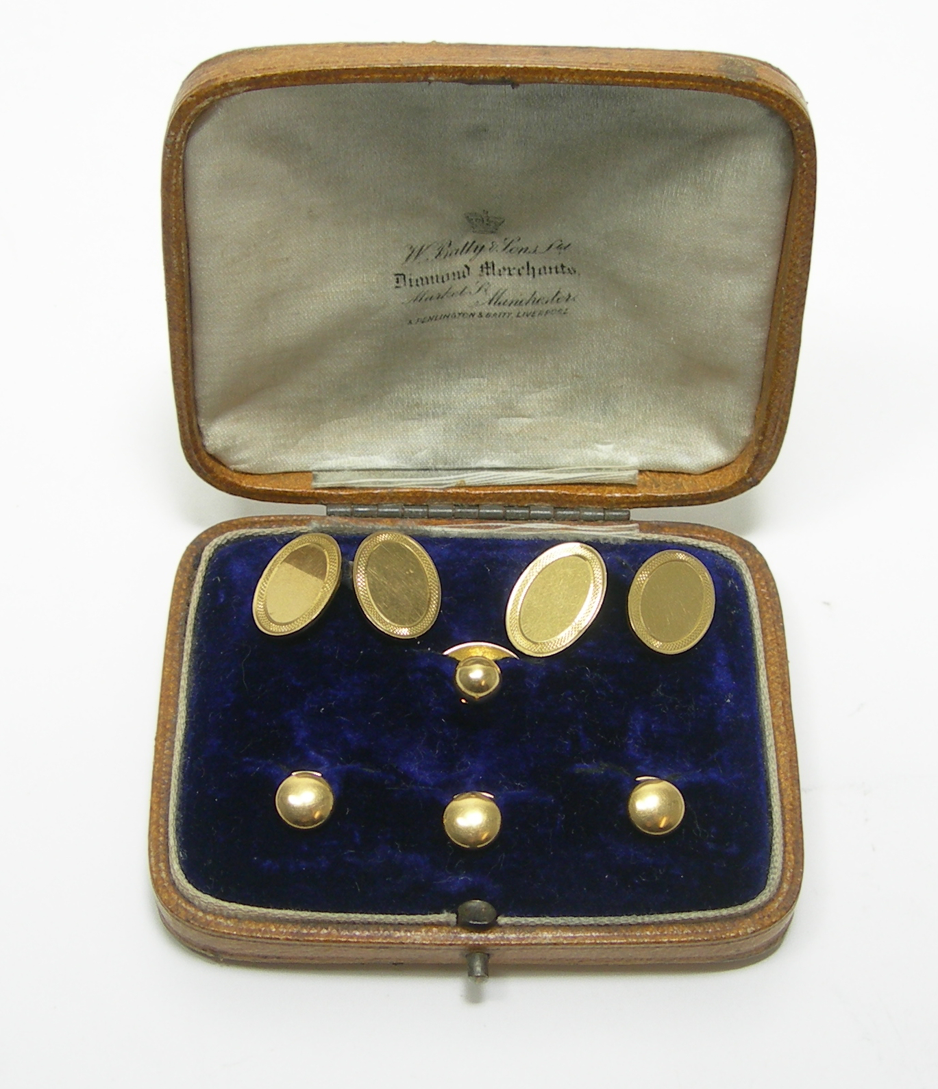 comprising a pair of cufflinks with engine turned borders to the oval terminals, conjoined by belcher links, together with four assorted studs, contained in a fitted leather case stamped W. BATTY & SONS LTD...