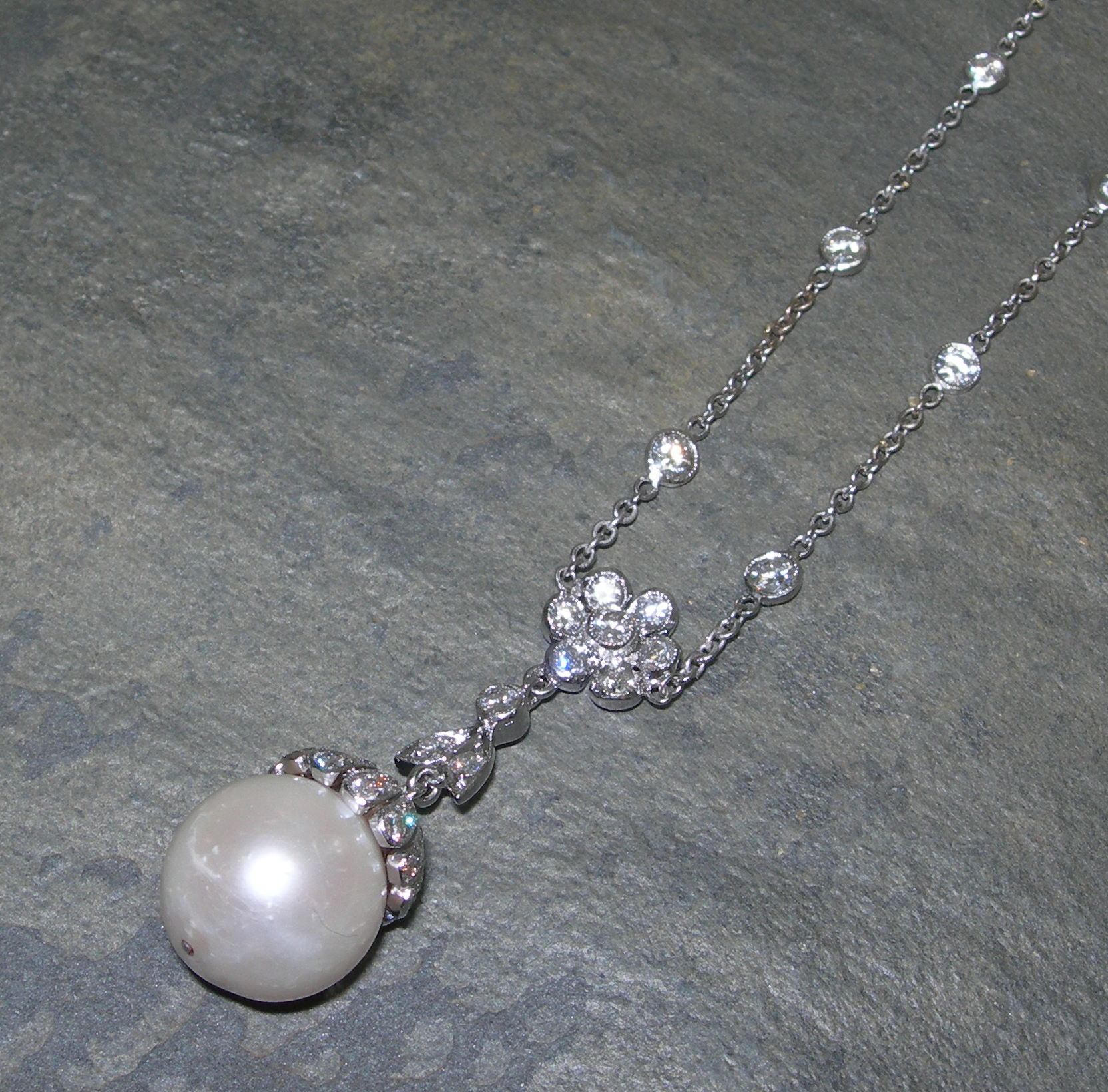 composed of fine belcher form links, spectacle set with round brilliant cut diamonds, with central collet set diamond floral motif, surmounting a similarly set foliate motif and capped South Sea cultured pearl drop, measuring approximately 11.5mm diameter, mounts stamped 750