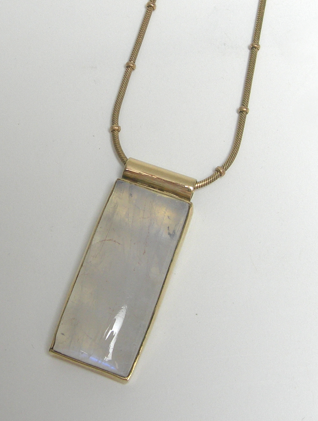the pendant of slim rectangular design, collet set with a rectangular cut moonstone cabochon, suspended from a fancy link chain