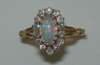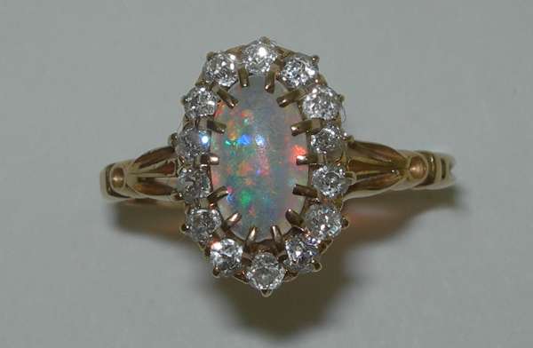 claw set to the centre with a slim oval cut opal cabochon, within a surround of old European cut diamonds flanked by split shoulders