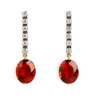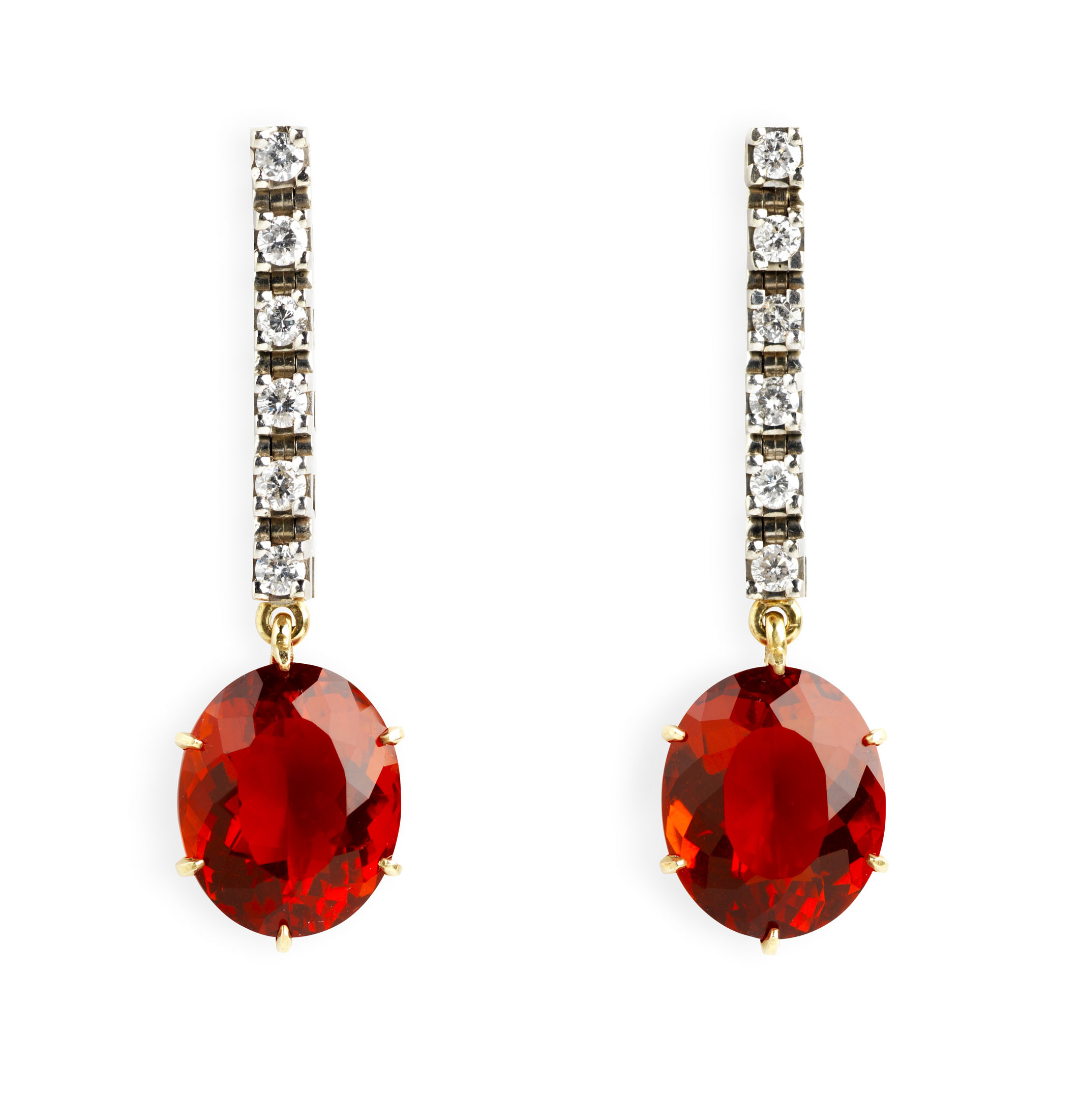 each composed of an articulated line of six claw set round brilliant cut diamonds, suspending a similarly set oval cut fire opal drop, with post and butterfly fittings