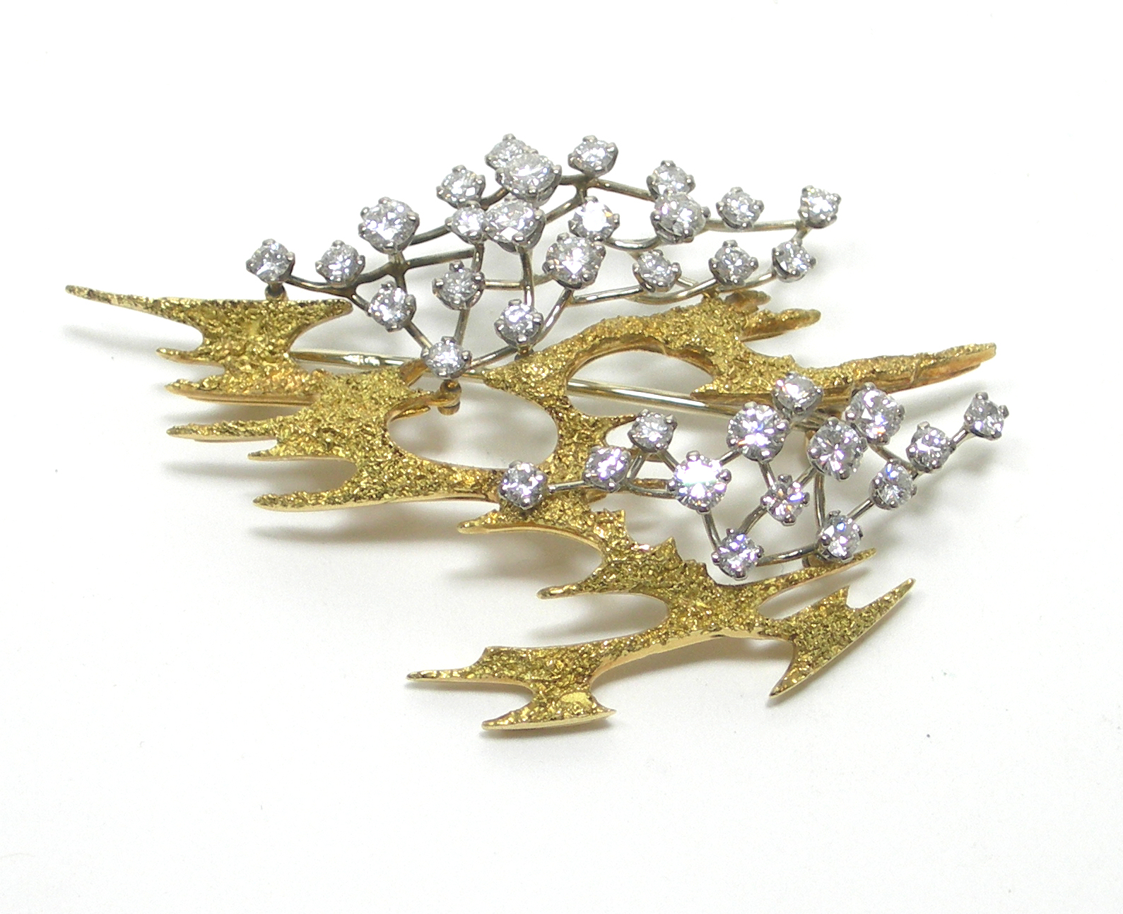 of asymmetric design, composed of textured jagged motifs interspersed by claw set graduated round brilliant cut diamonds to a wirework ground