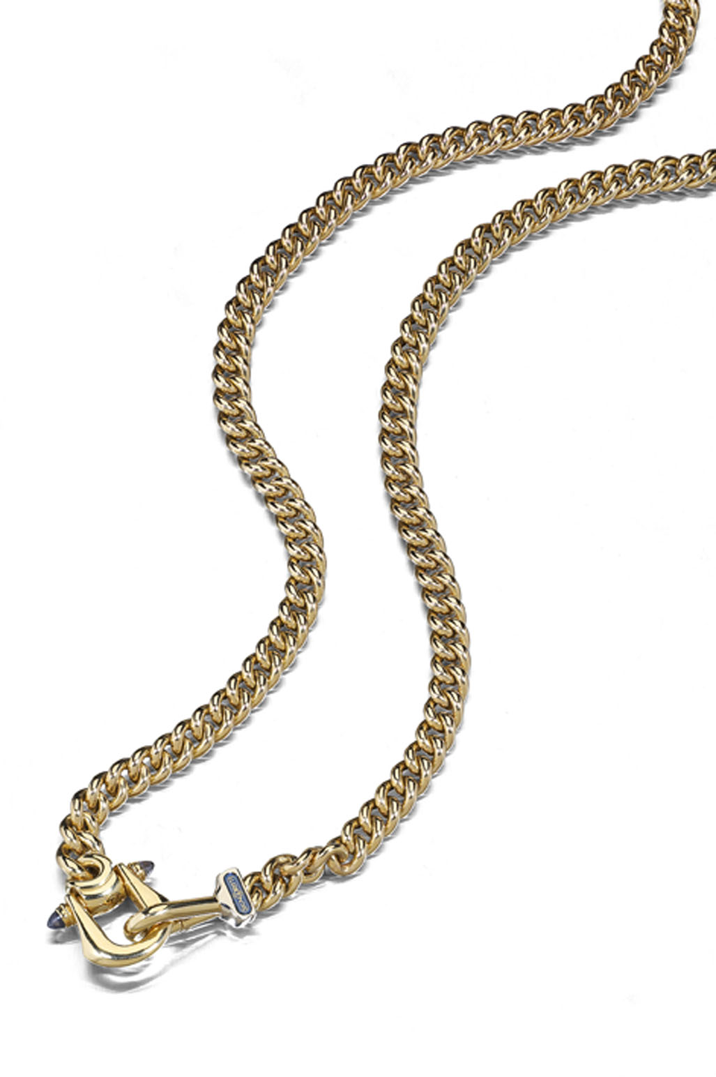 composed of uniform links, with stirrup form clasp, set to each terminal with a pointed oval blue cabochon