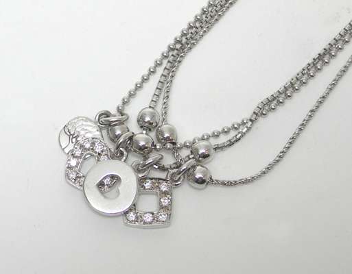 composed of beaded and fancy box form links, suspending assorted heart-pierced circular and shaped square charms, two set with round brilliant cut diamonds, clasp stamped 750