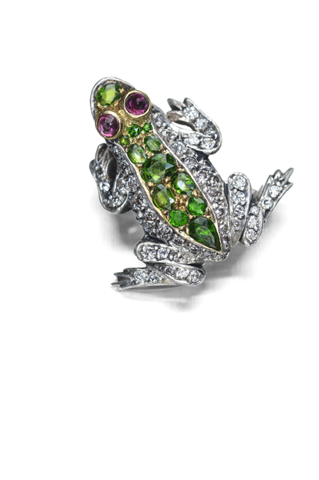 designed as a frog, with circular cut ruby cabochon set eyes and central border of demantoid garnets, also set with graduated old European cut diamonds