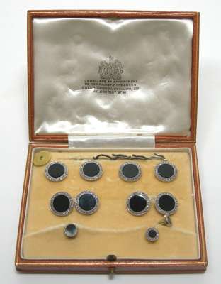 comprising a pair of cufflinks, four buttons and two studs, each with circular terminal, set with a circular cut onyx panel within a rose cut diamond border, with an additional matched stud, contained in a fitted leather case stamped COLLINGWOOD (JEWELLERS) LTD...