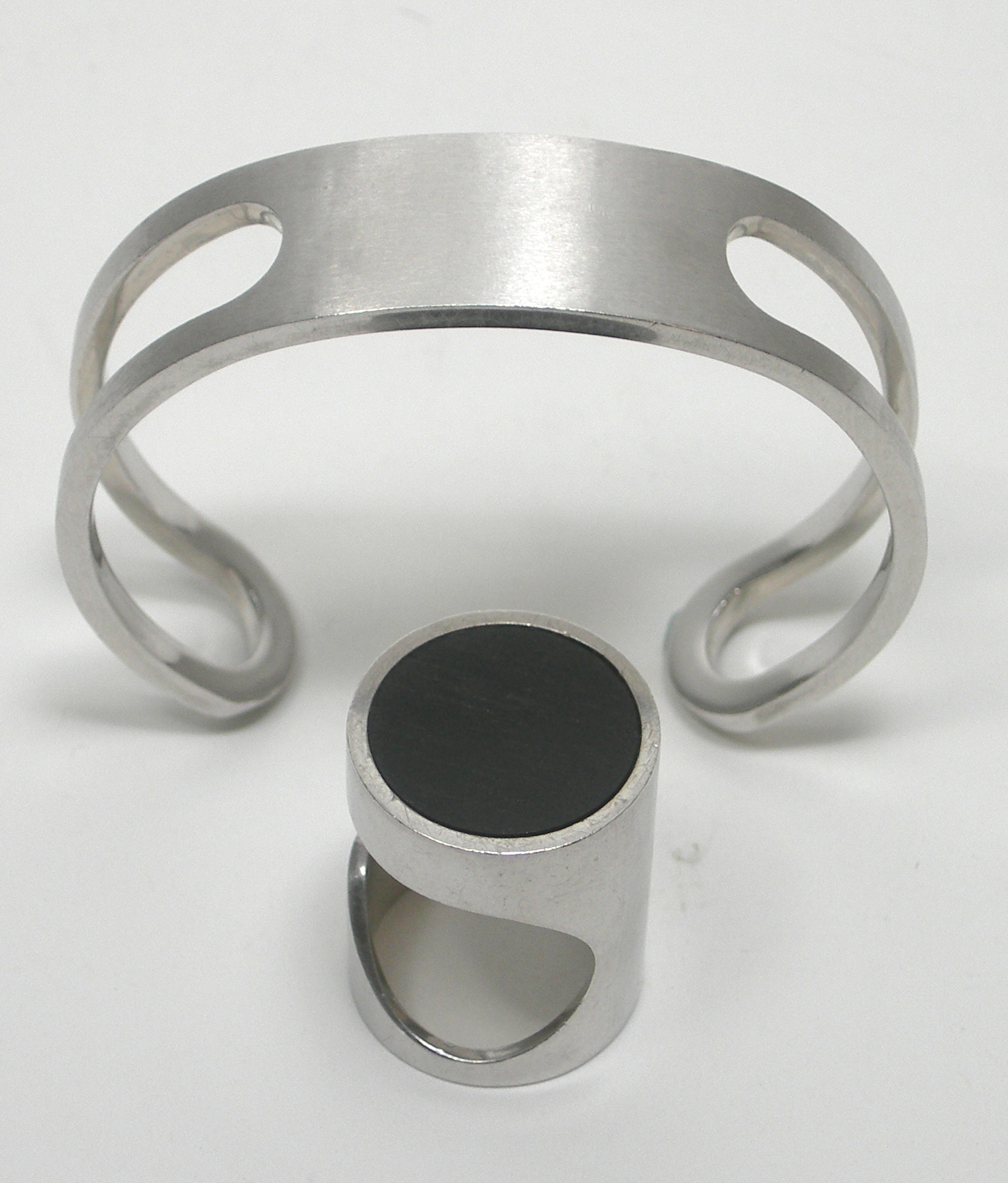 both signed P. CARDIN, also stamped with French control marks, the bangle of torque design with open sides and satin finish, the ring of open cylidnrical form with circular front inset with an ebonised circular panel (2)
