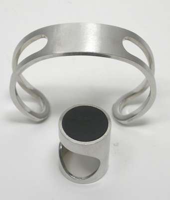 Italian born French fashion designer Pierre Cardin, was known for his avant-garde style and space age designs. He was also, one of the first French couturiers to introduce the Unisex look. Likely to date from the mid-1960's this bangle and ring demonstrate his preference for geometric shapes and motifs.