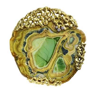 Born in 1921, Andrew Grima was a British Royal jeweller, designer and artisan. He became the foremost modern jewellery designer in the West End of London in the 1960s and 1970s, selling his designs from his exclusive gallery in Jermyn Street. Grima received the Queen's Royal Warrant in 1966 and was commissioned to make various items of jewellery for the British and Scandinavian Royal Families. A Freeman of the City of London and Liveryman of The Worshipful Company of Goldsmiths, Grima also established shops in New York, Sydney, Zurich, Tokyo and Lugano. Winner of twelve De Beers Diamond International Awards Grima was particularly interested in the organic possibilities of jewellery design, deciding to move away from the forms and materials of classical jewellery prevalent at the time. Preferring yellow gold to silver, textured and unconventional stones over classic shapes and cuts, Grima's work features exotic stones valued both for their visual impact and associations. Precious stones when used are incorporated decoratively, not as integral parts of the design.