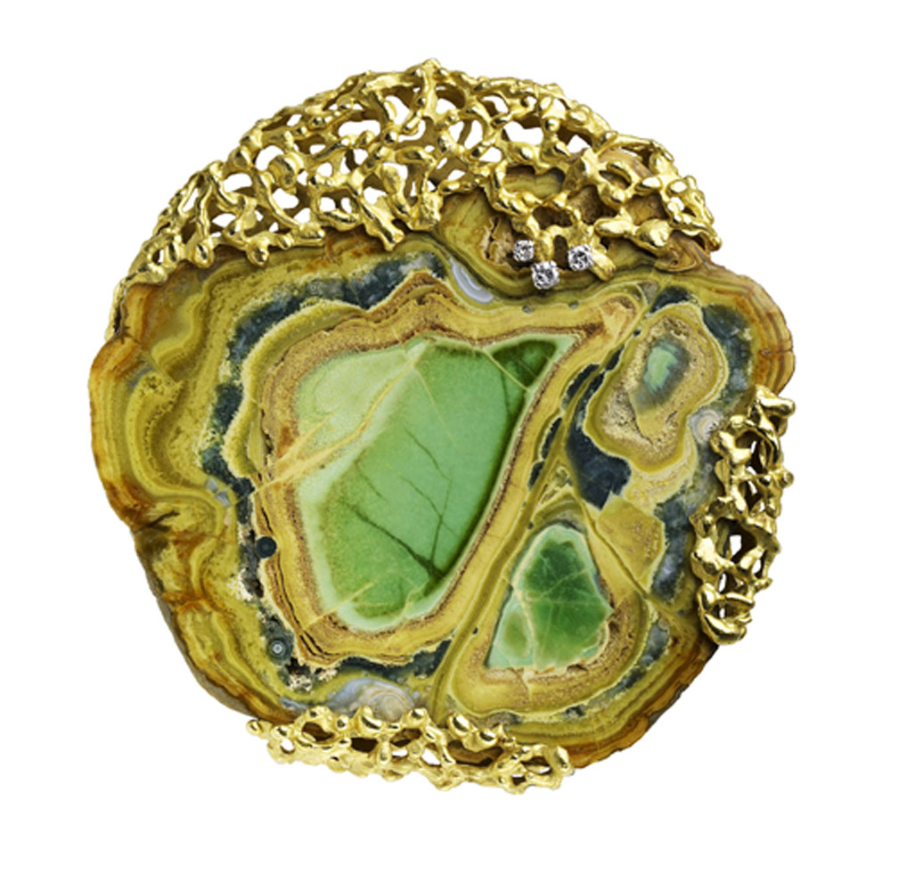 ANDREW GRIMA - a 1960's 18ct yellow gold, variscite and diamond set brooch/pendant,