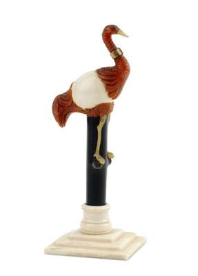 modelled as a carved ostrich, with ovoid ivory body, surmounting an ebonised pillar, to a stepped square ivory base