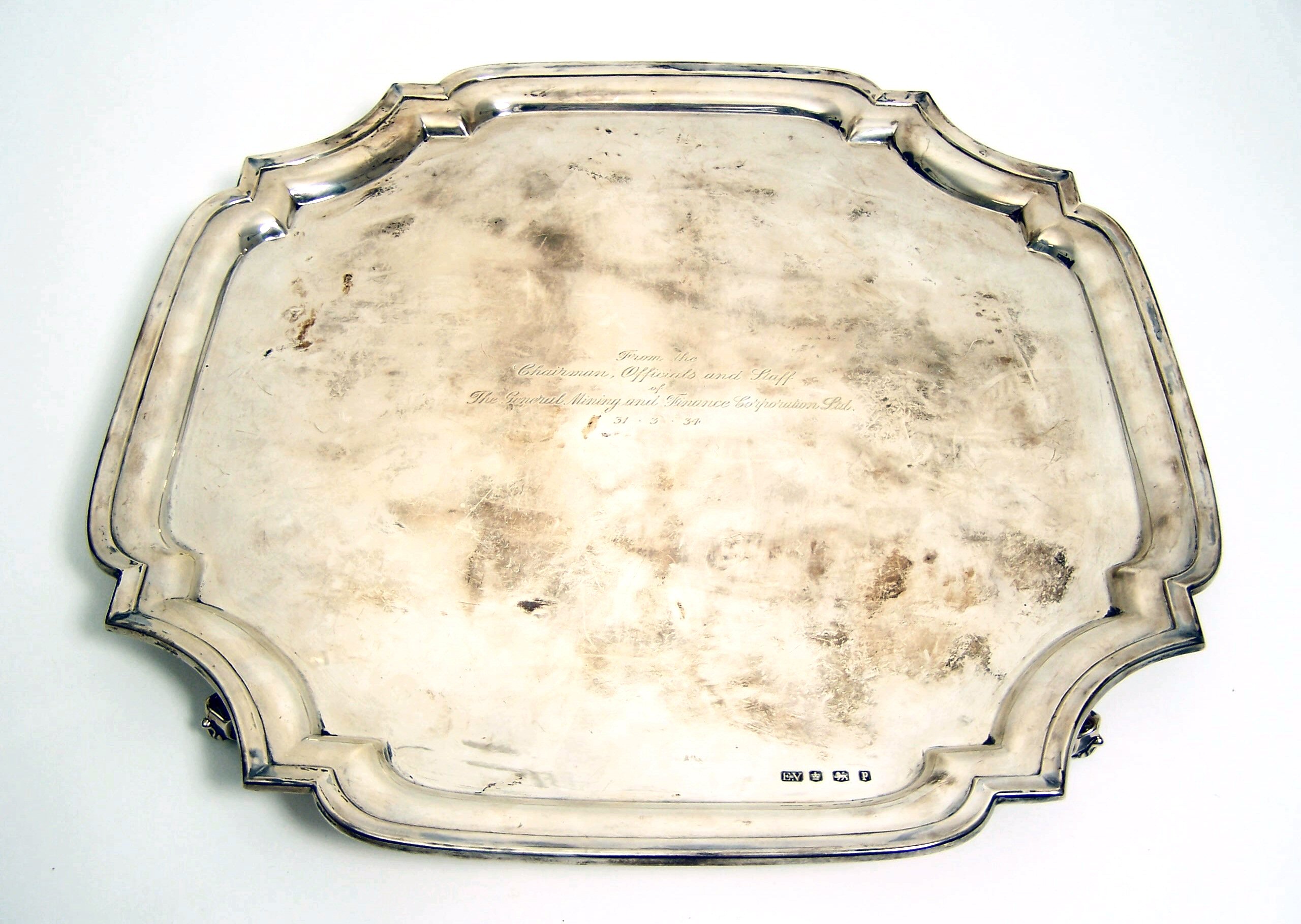 Viners, Sheffield 1932, of square outline with canted corners and raised border, the centre engraved with presentation inscription 'From the Chairman, Officials and Staff. The General Mining and Finance Corporation 31.3.34', raised on four scroll feet.