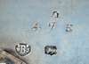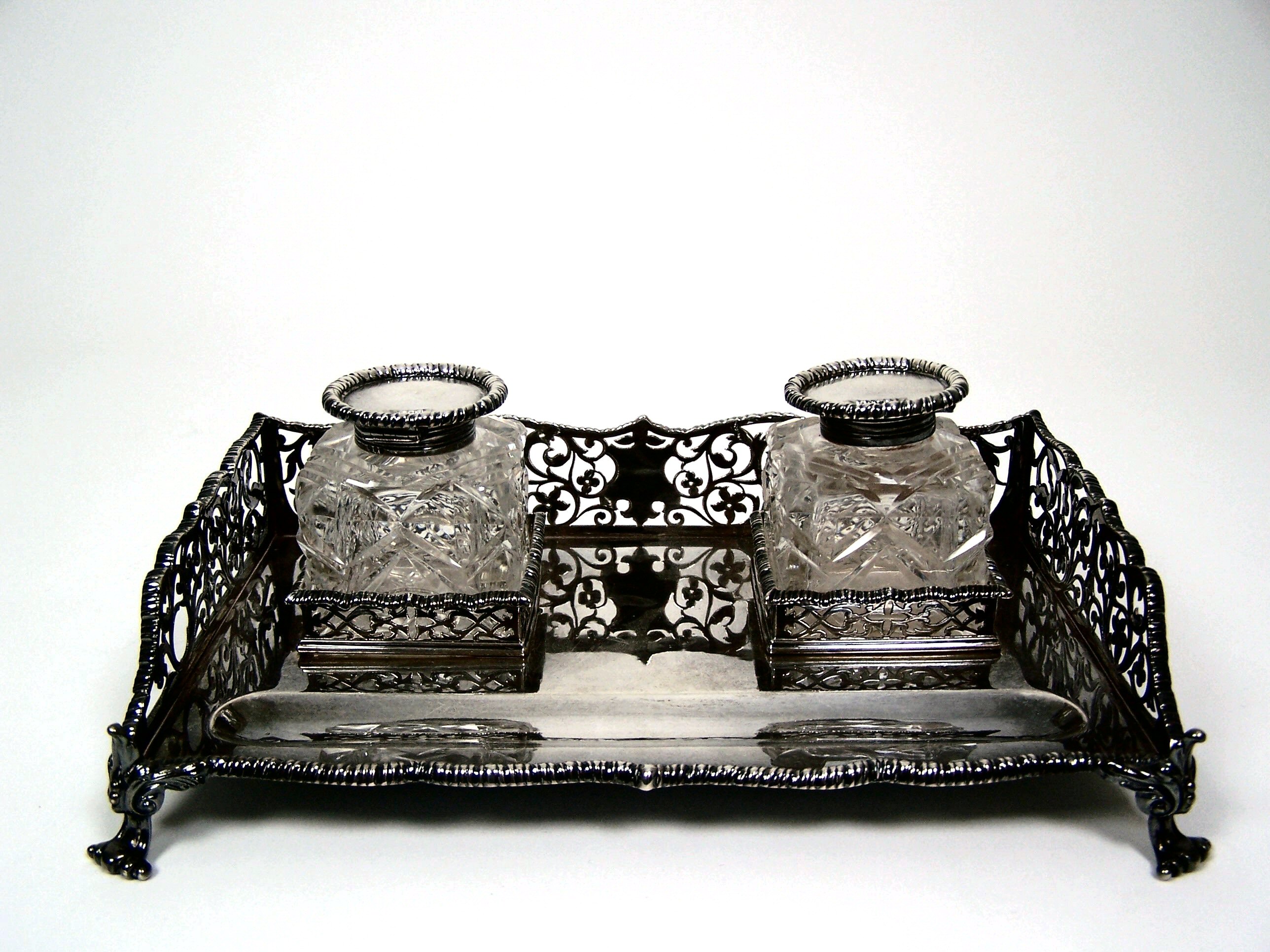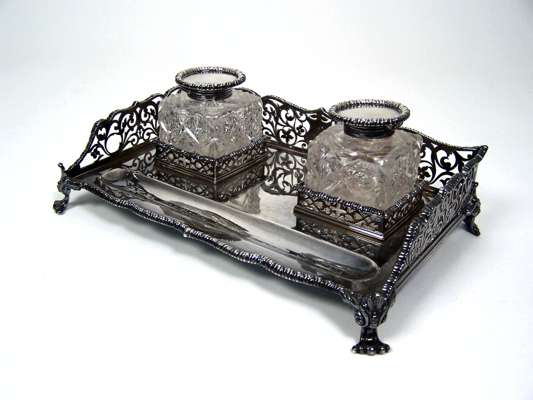 retailed by Goldsmiths Company, of typical rectangular outline with pierced scroll gallery with reeded scalloped rim, with two similar frames for cut glass inkwells and a pen tray