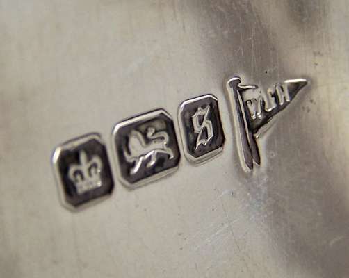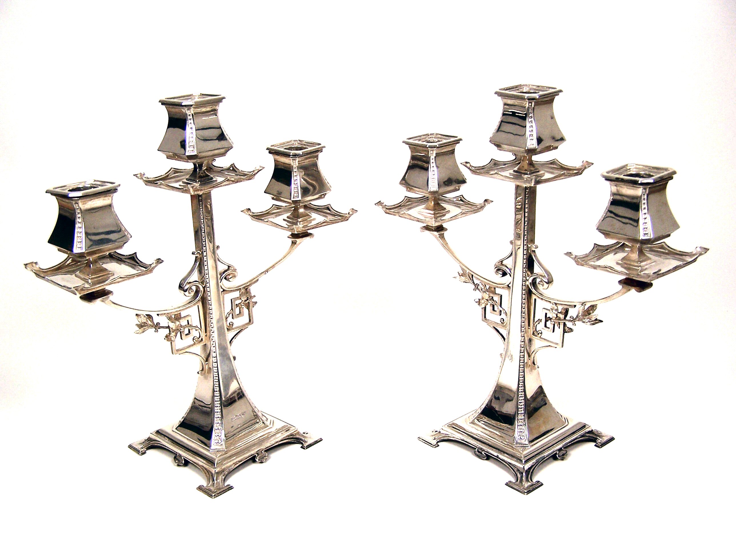 Walker and Hall, Sheffield 1910, the central slender stem with flared lower section, with two scroll arms with Greek key support with foliate branch trailing through, the shaped square drip pans with square section candle sconces, the whole raised on stepped spreading squarebase with bracket feet to corners (2)
