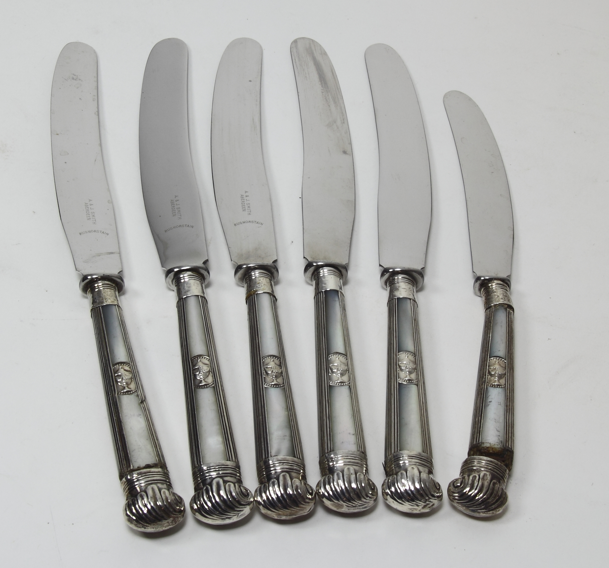 with indistinct Sheffield marks, the handles with ribbed silver mounts with mother of pearl sections, with oval urn cartouches, beaded borders, blades later replaced (24)