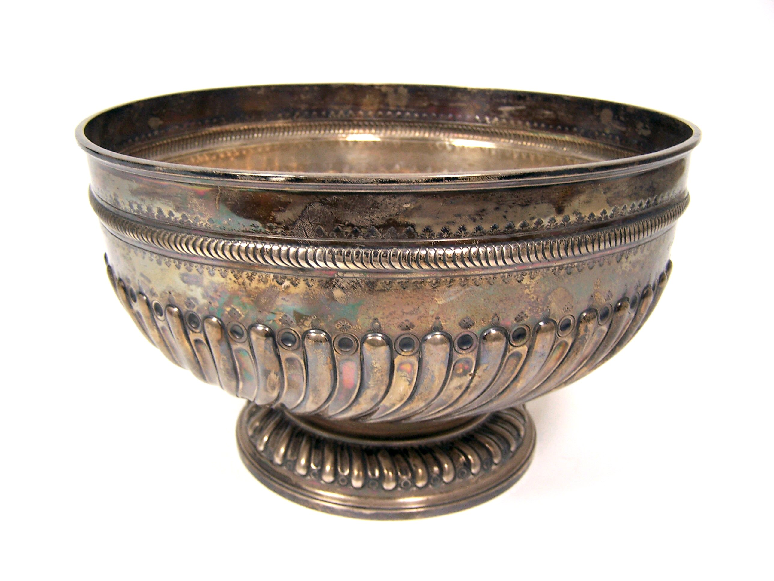 Charles Stuart Harris, London 1894, with a moulded girdle, semi gadrooned bowl with a pedestal base, 34 oz., diameter 27 cm