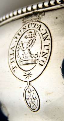 Daniel Smith & Robert Sharp, London 1782, of ogee oval form, beaded rims, engraved crests of a griffin issuing from a coronet and motto 'Tria juncta in Una',