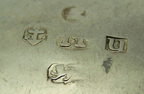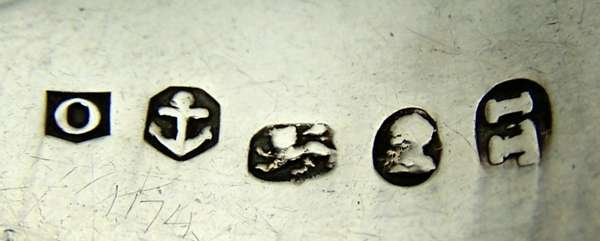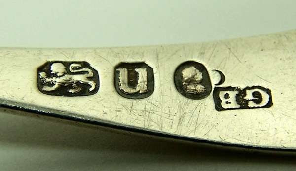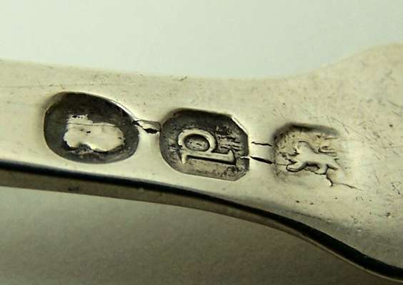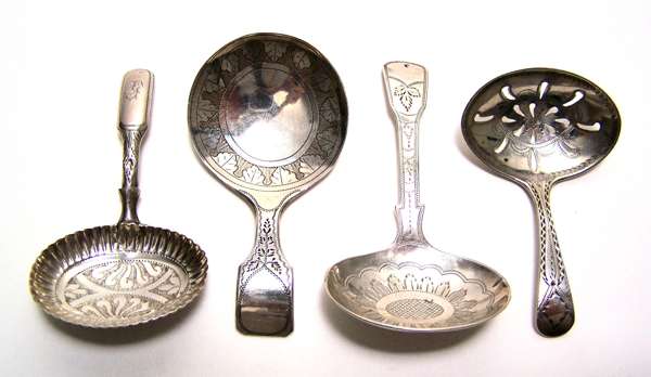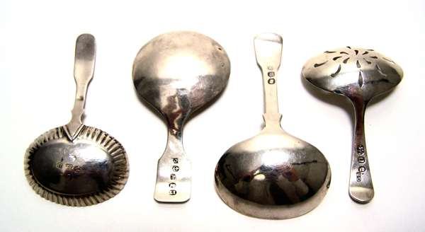 Birmingham 1812, Fiddle pattern with circular shallow bowl with wriggle work borders; another Fiddle pattern example with oval bowl with stylised flower head to bowl, London 1819; an Old English pattern example with pierced bowl Birmingham 1792; and another Fiddle pattern example with hollow handle (4)