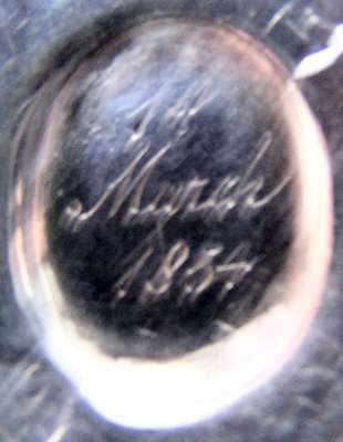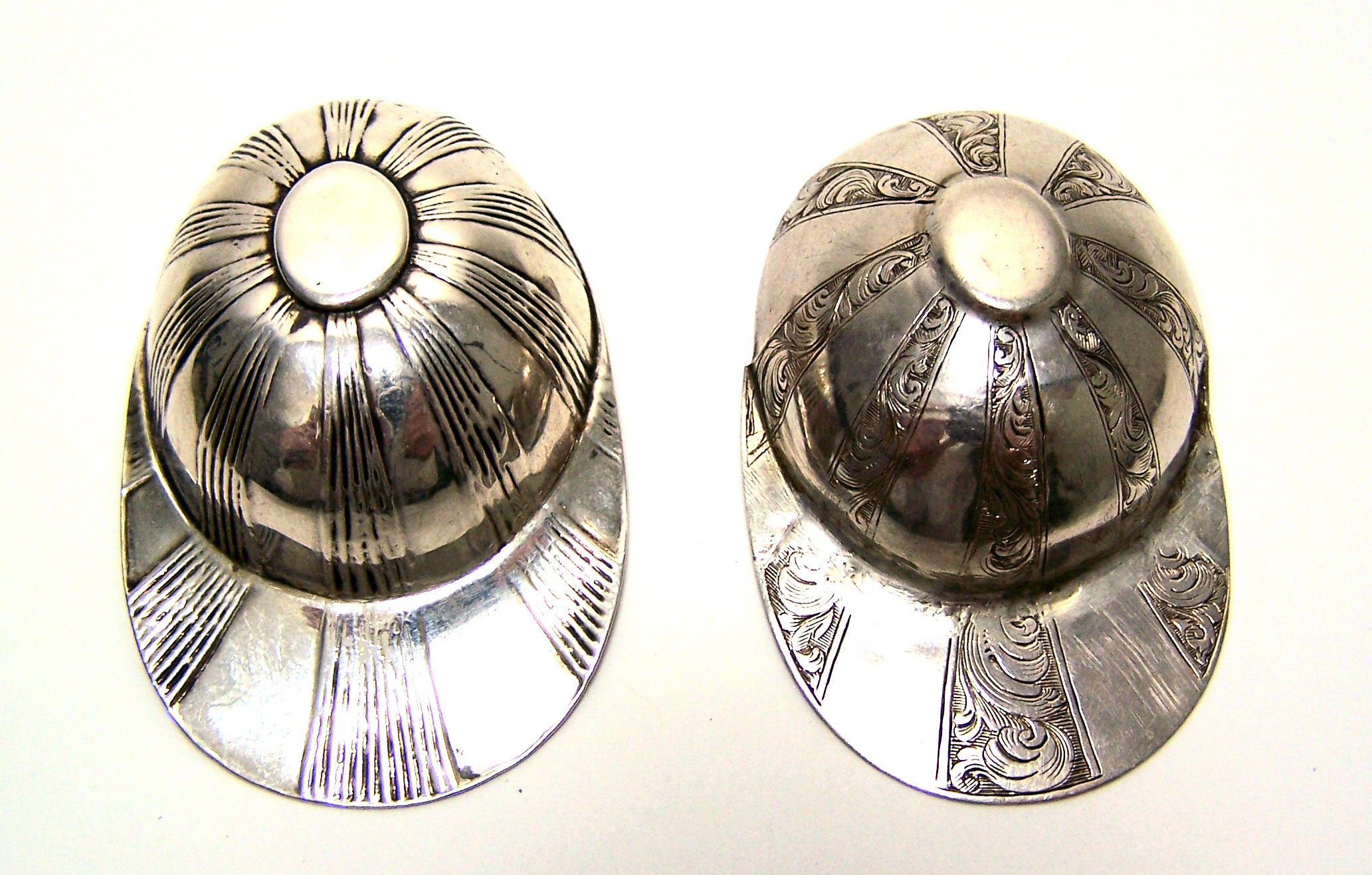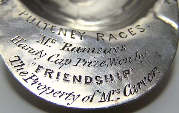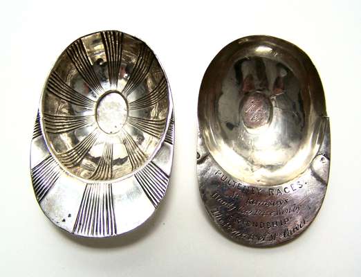 with part George III marks (lion passant and duty head only), of conventional form with linear decoration; together with a similar example apparently unmarked, with foliate engraved detail and inscribed to underside of brim 'Pultney Races Mr Ramsay's Handy Cap Prize Won by Friendship, property of Mrs Carver' (2)