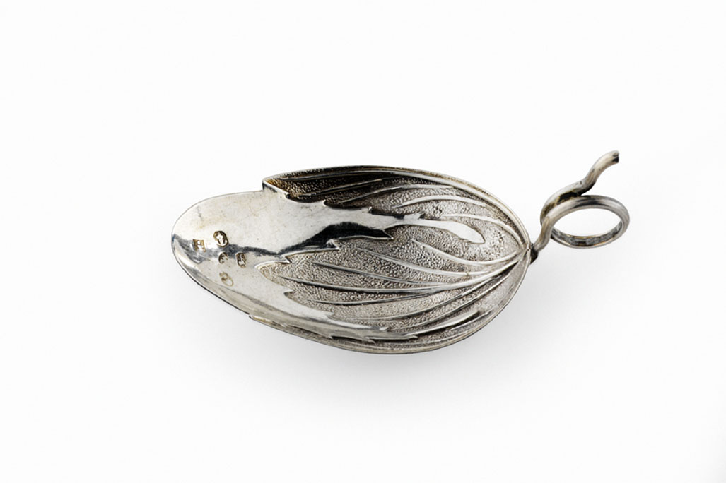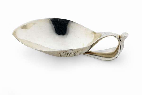 J.W, part Birmingham marks (date letter and town mark lacking), with simple shaped leaf formed bowl with detailed loop handle, the bowl engraved with initials RA in foliate script and T in monogram; together with another leaf bowl example with loop handle, Birmingham 1807 (maker's mark indistinct) (2)