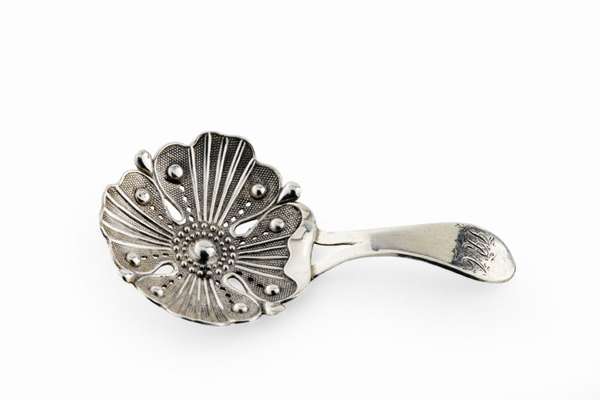 J Taylor Birmingham 1781, with flower head bowl with pierced detail and Old English pattern handle with engraved foliate initials IRA to terminal; together with an unmarked filigree example (2)