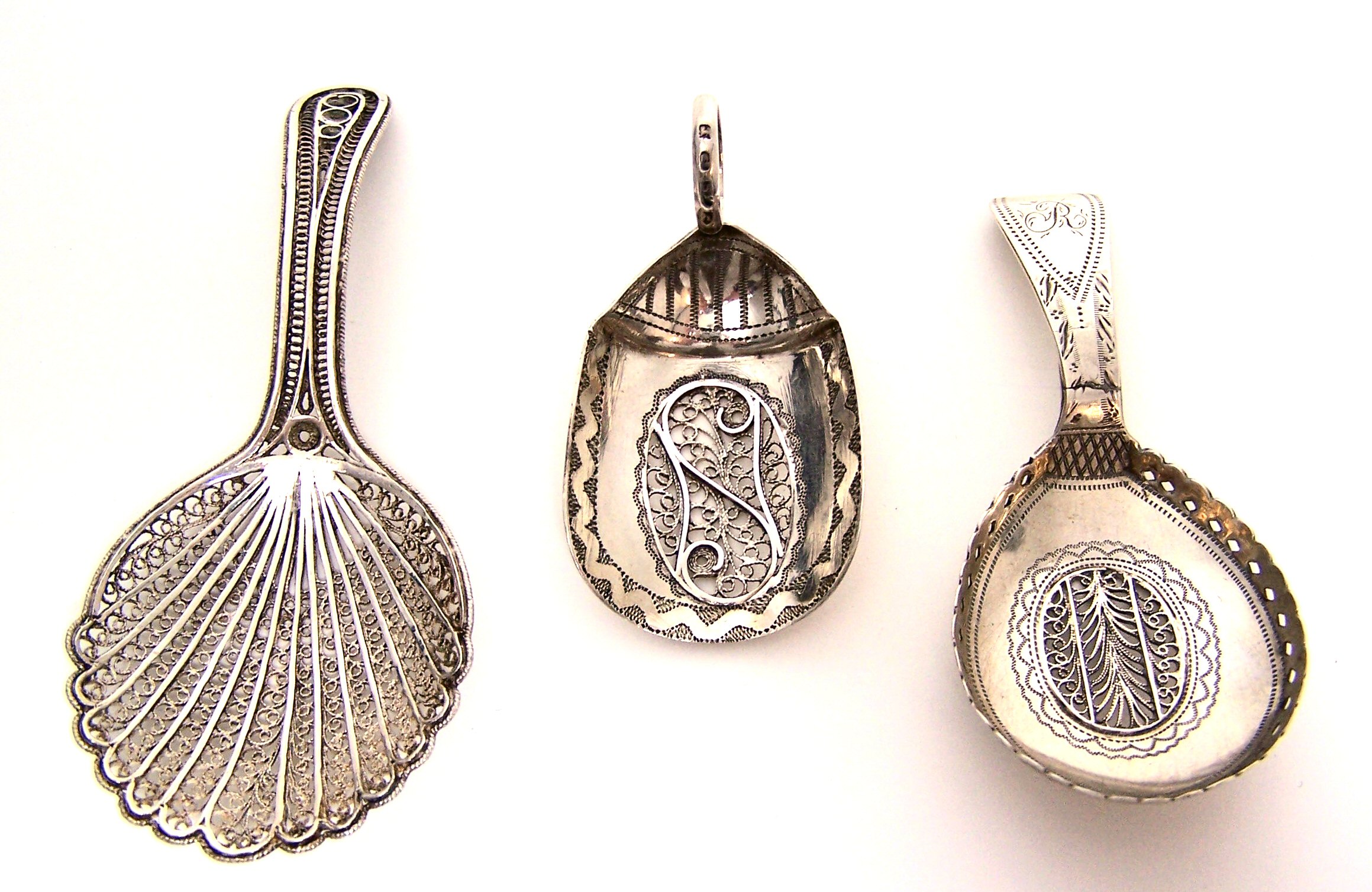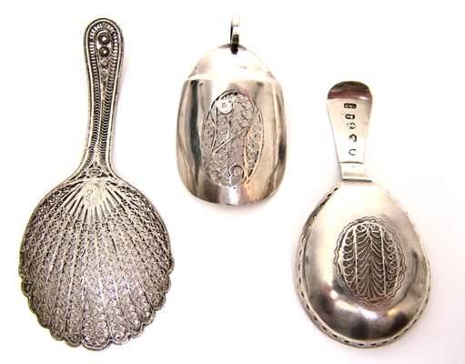 Samuel Pemberton Birmingham 1805, with short shovel bowl with wriggle work borders an oval filigree section to centre, with simple loop handle; a George III caddy spoon with oval bowl with pierced border and oval filigree centre section, Birmingham 1803; together with an unmarked filigree example with scalloped bowl (3)