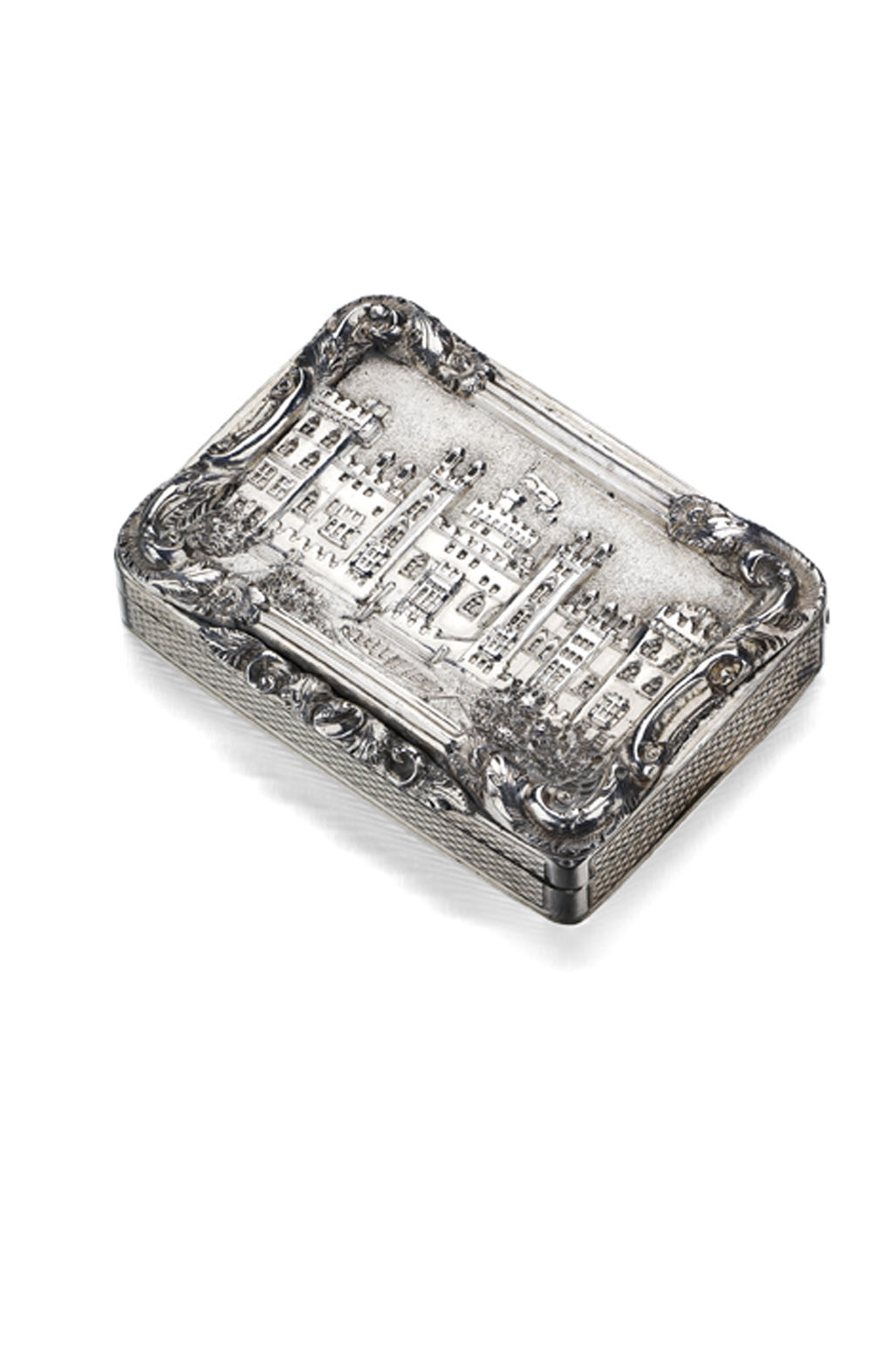 George Willmore, Birmingham 1849, of oblong form, the lid cast with the East Terrace of Windsor Castle, c-scroll border with engine turning to the base, engraved foliate grille,