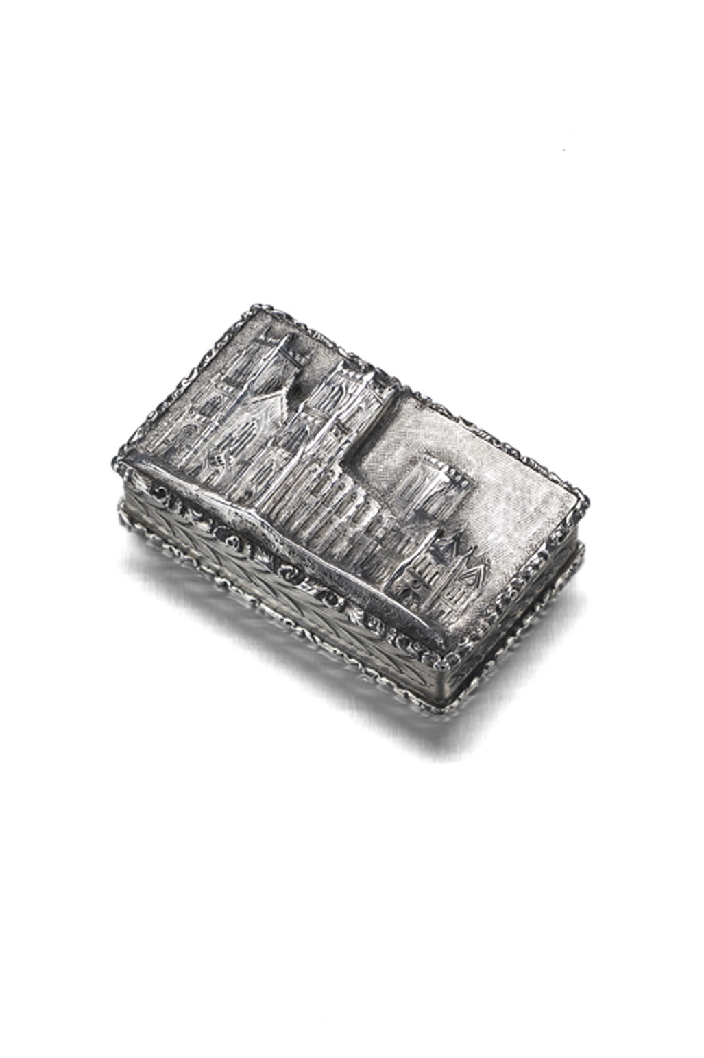 Wheeler & Cronin, Birmingham 1843, the lid in high relief with Westminster Abbey, engraved grille