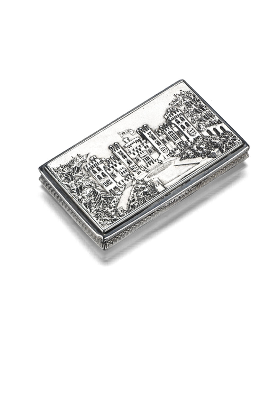Nathaniel Mills, Birmingham 1827, oblong form, the lid cast with the East Terrace of Windsor Castle, with engine turning to the base, engraved foliate grille,