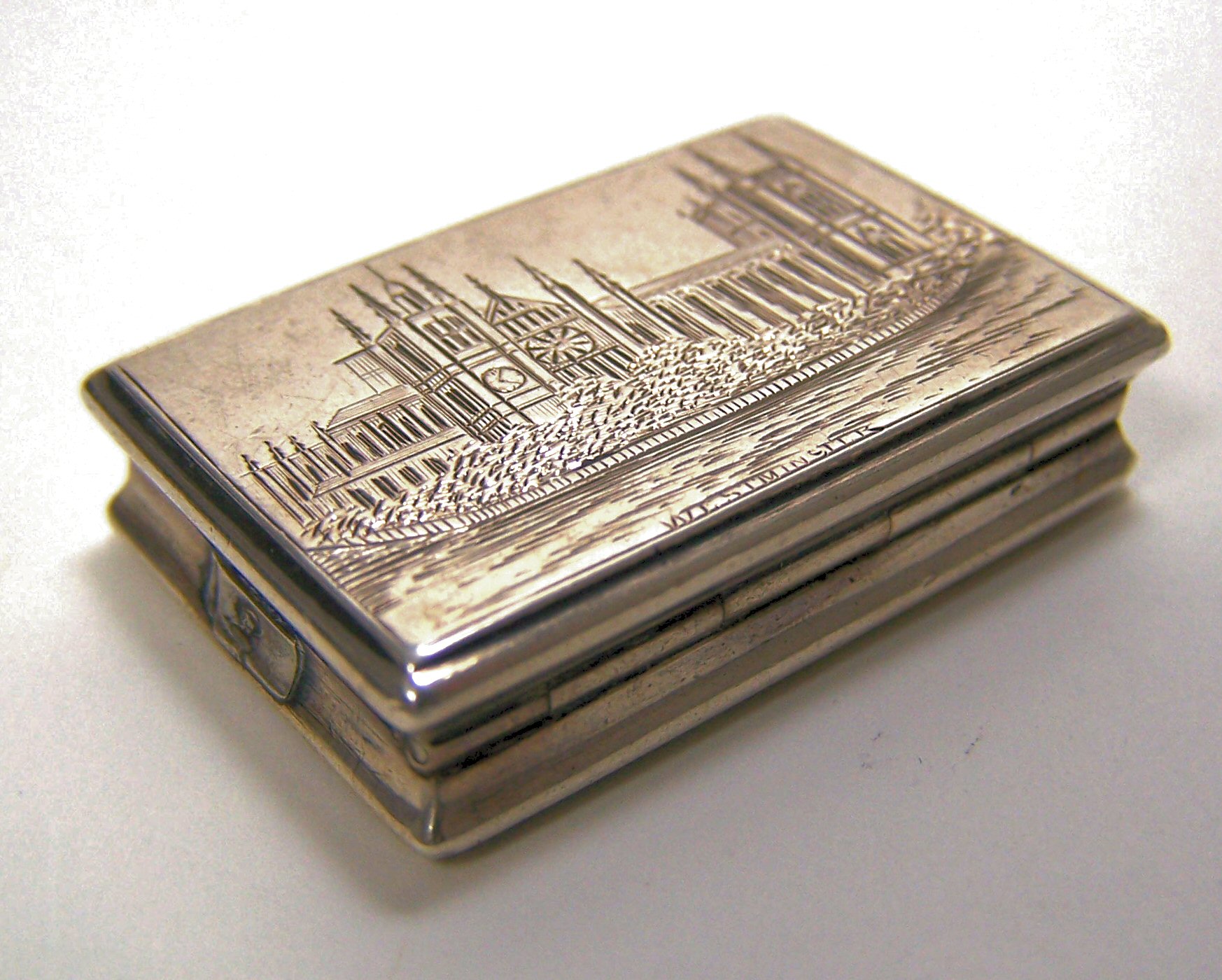 Taylor and Perry, Birmingham 1841,the lid engraved with Westminster Abbey, engraved grille