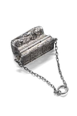 John Tongue, Birmingham probably 1827, oblong form, the lid cast with Windsor Castle, chased floral decoration to the bombe sides, with safety chain