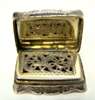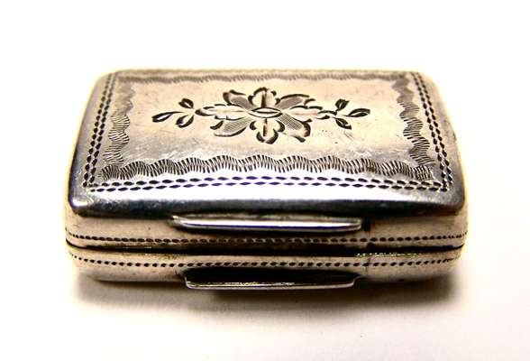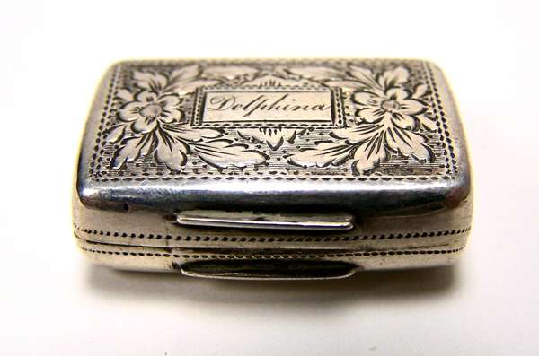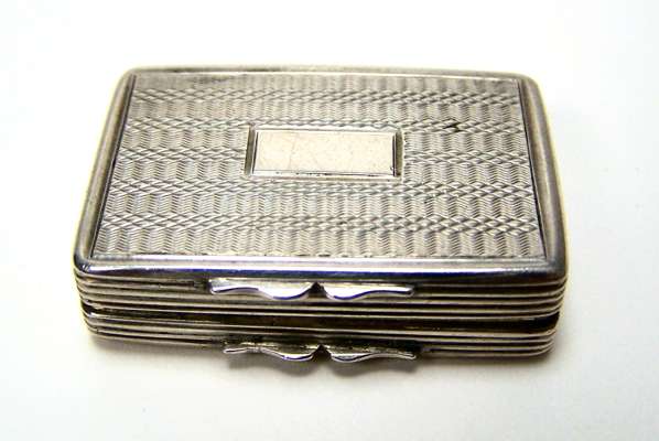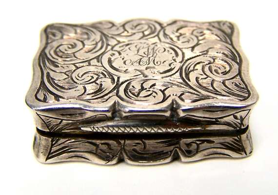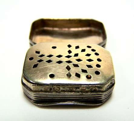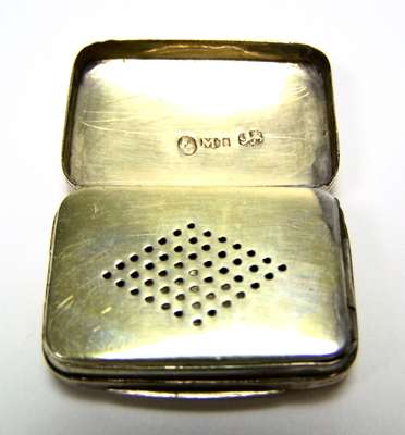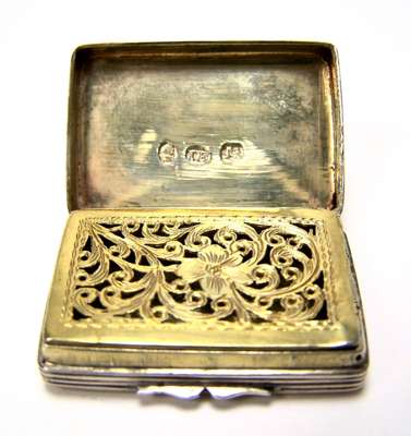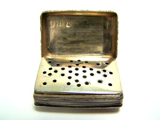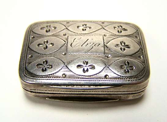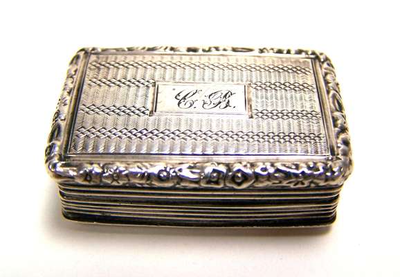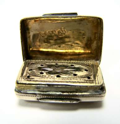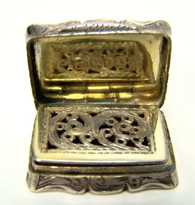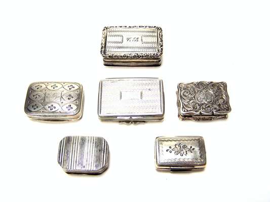 John Lawrence, Birmingham 1833, cast foliate border, engine turned decorated cover and base, gilt pierced grille, 33mm; Edward Smith, Birmingham 1885, of serpentine outline, scroll engraved cover and base, gilt pierced grille, 25mm; J Bettridge, Birmingham 1832, moulded rim, engine turned decoration, pierced gilt grille, 33mm; and three other small vinaigrettes