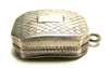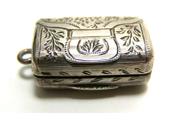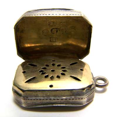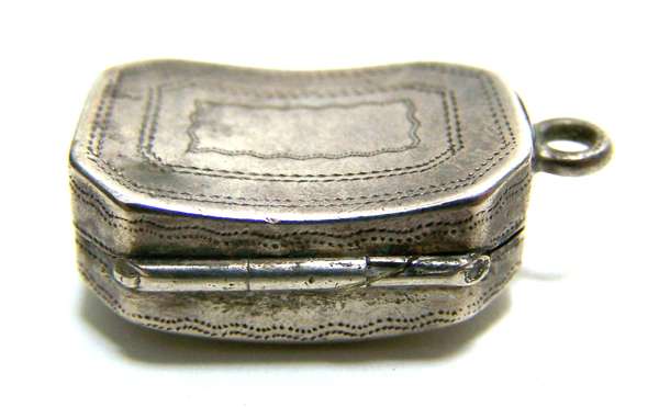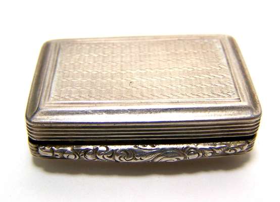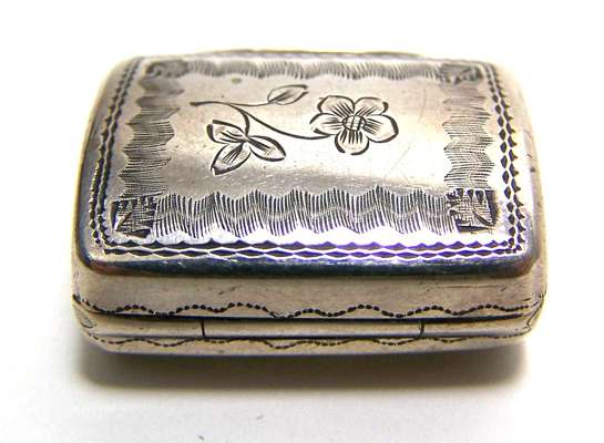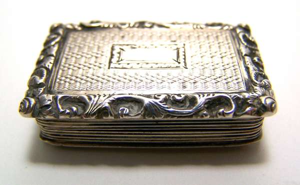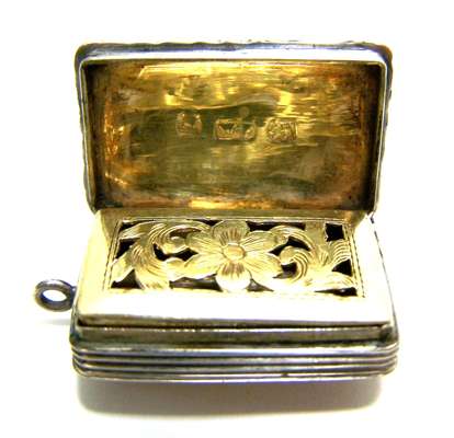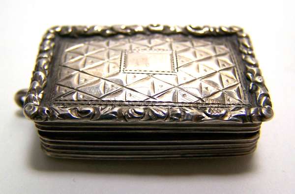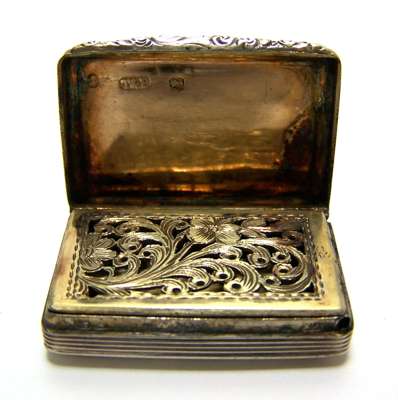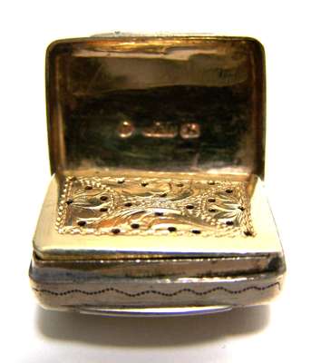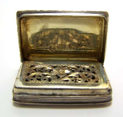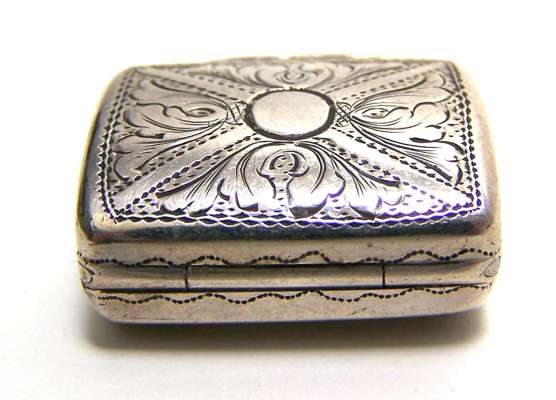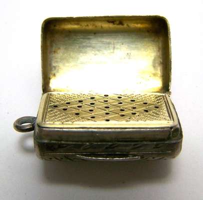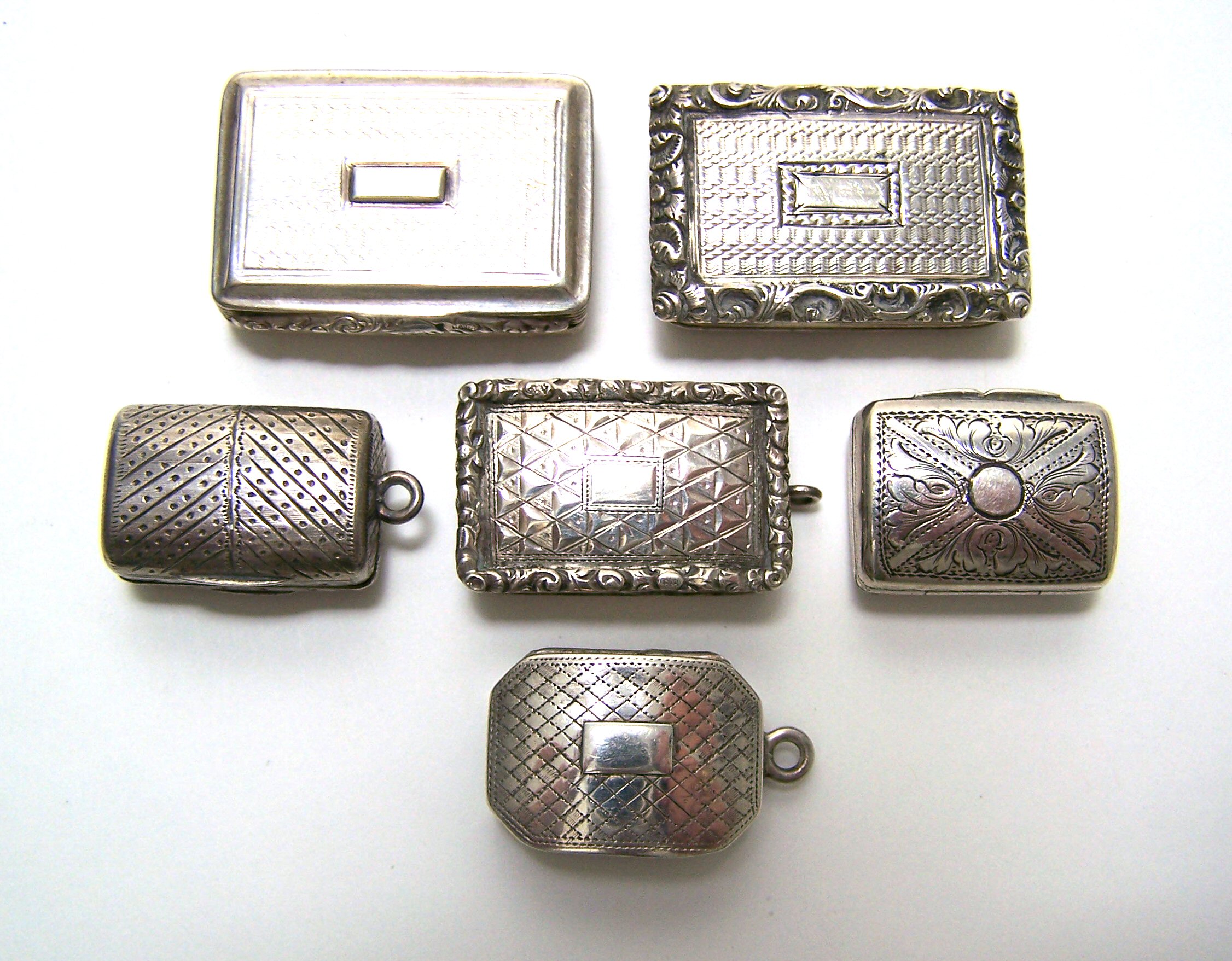 William Pemberton, Birmingham, circa 1830, cast foliate border, engine turned decorated cover and base, 27mm; Samuel Pemberton, Birmingham 1810, of saddle shape, simple engraved woven design, pierced simple grille, 25mm; an early 19th century valise shaped vinaigrette well engraved decoration, simple pierced grille, 23mm; and three other small vinaigrettes