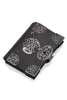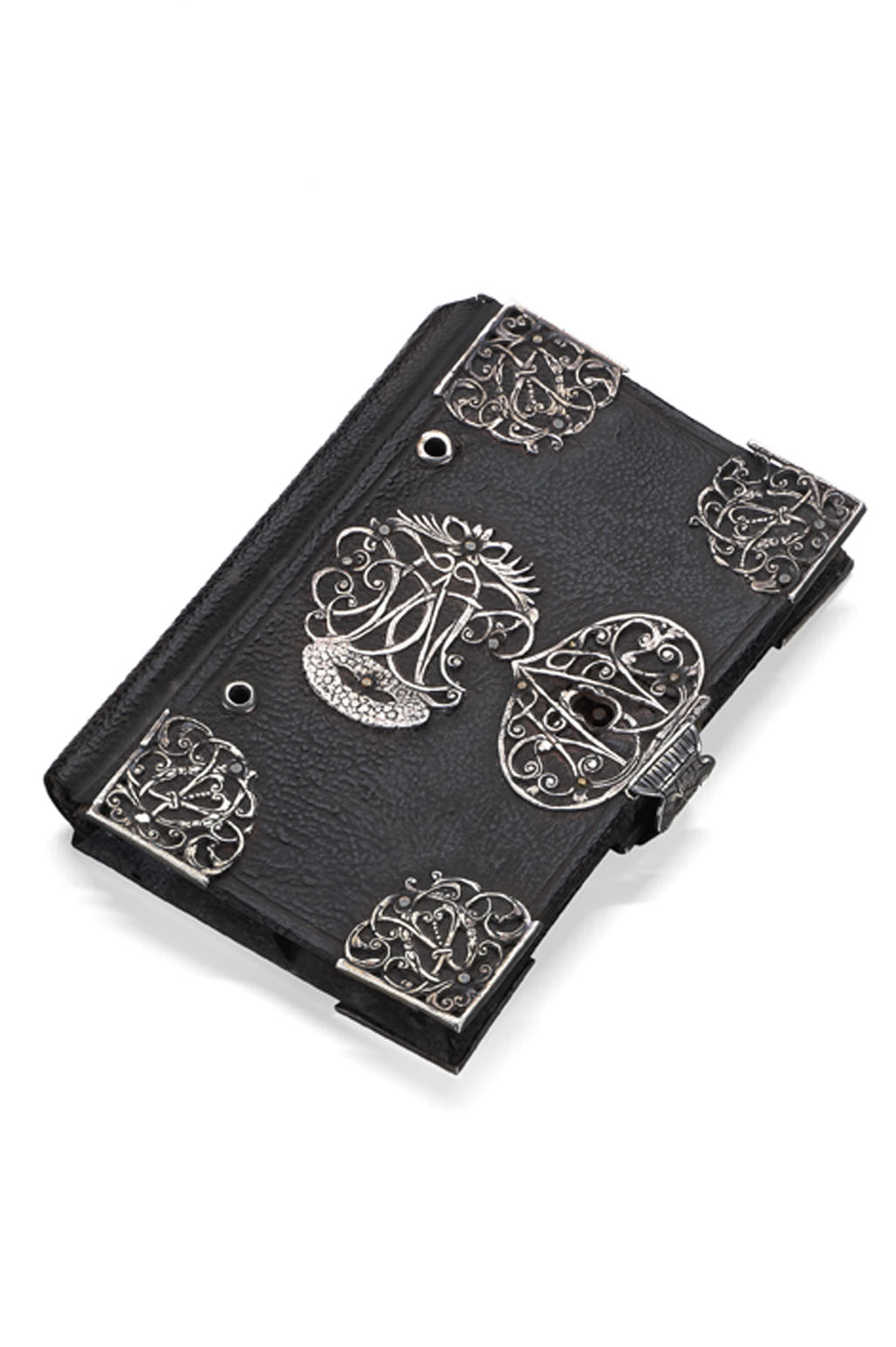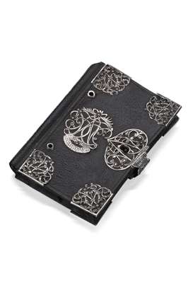 mounts unmarked, the textured leather body set with pierced scroll mounts to corners, decorative lock escutcheon and clasp and set with initials in monogram, the interior with an ivory page