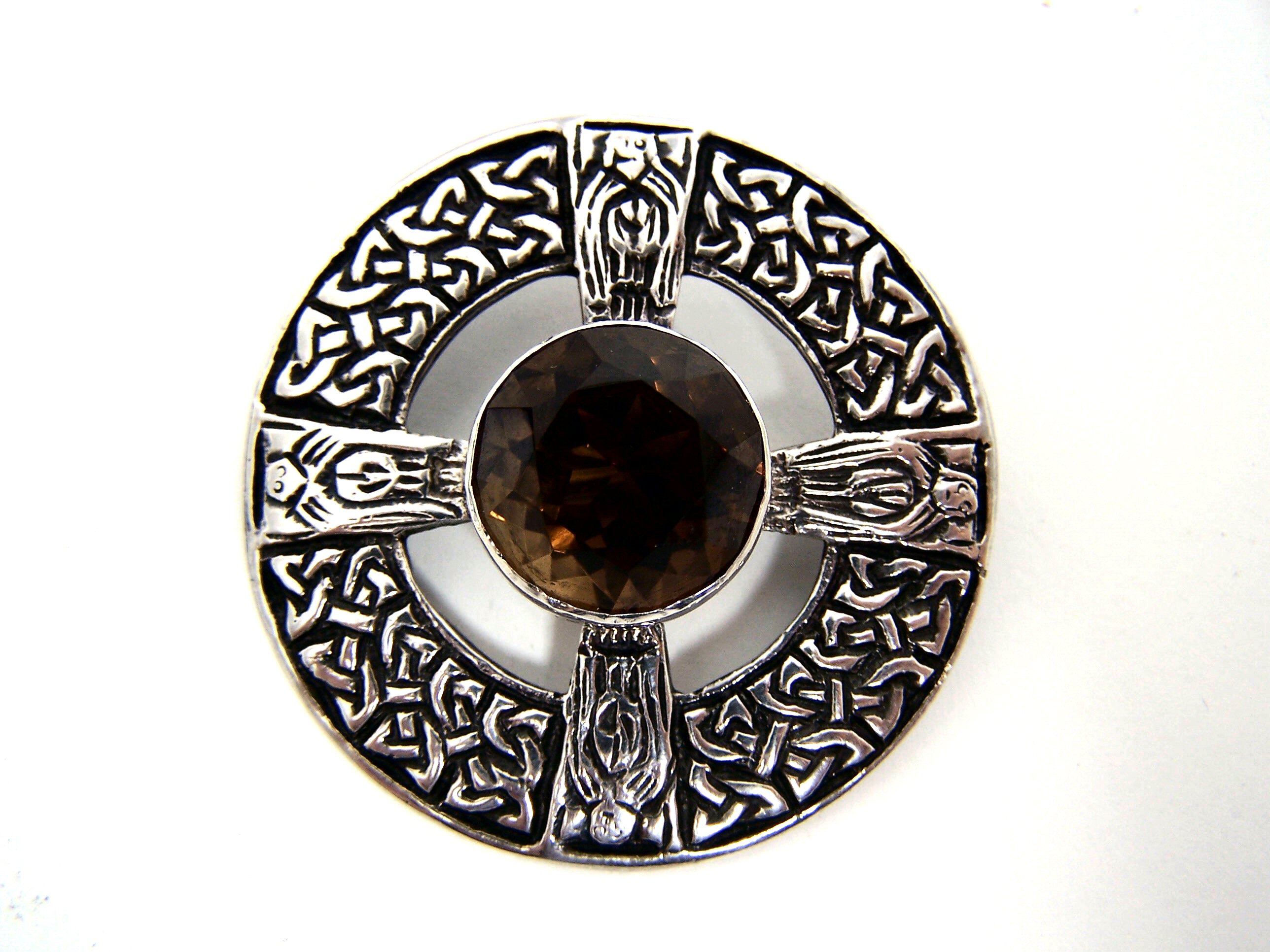 by J Fraser, for Medlock & Craik, marked JF (in monogram incuse), M&C, Edinburgh 1958, INVSS, in a similar style to the Iona prioress brooch, with Celtic knot border and four standing figures with collet set Cairngorm to centre