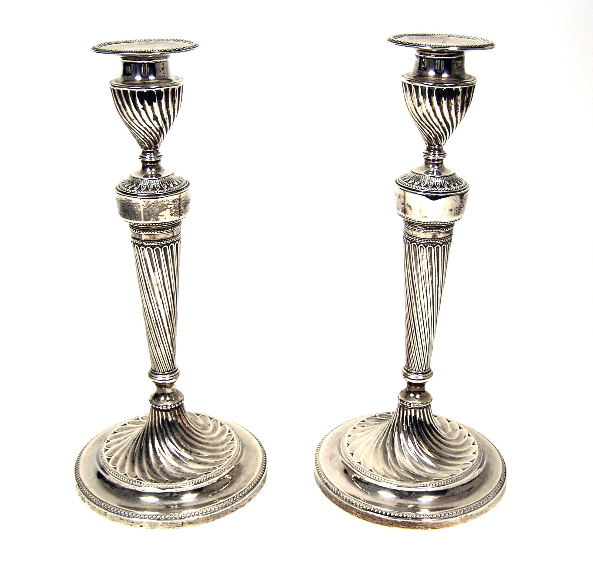 Elkingtons Sheffield 1894, the tapered columns and spreading circular foot with spiralled fluted designs and beaded borders, the urn shaped sconce similarly decorated (2)