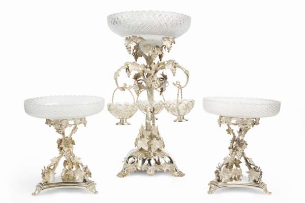 by J & E Bradbury Sheffield 1865 and London 1869, comprising centre piece and garniture, the epergne centrepiece formed as a twisted fruiting vine with three branches suspending scalloped vine baskets, with large cut frosted glass bowl to centre, the whole raised on a domed base with three shell formed bracket feet; together with garniture pair of comports similarly formed on trefoil bases, with frosted glass bowls (3)