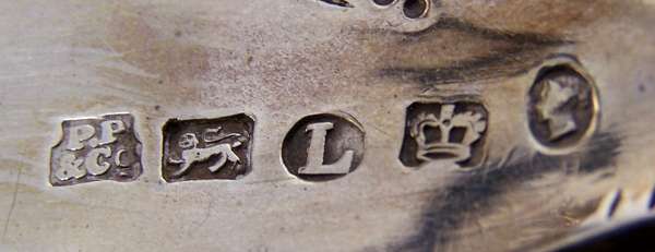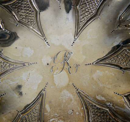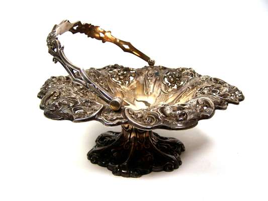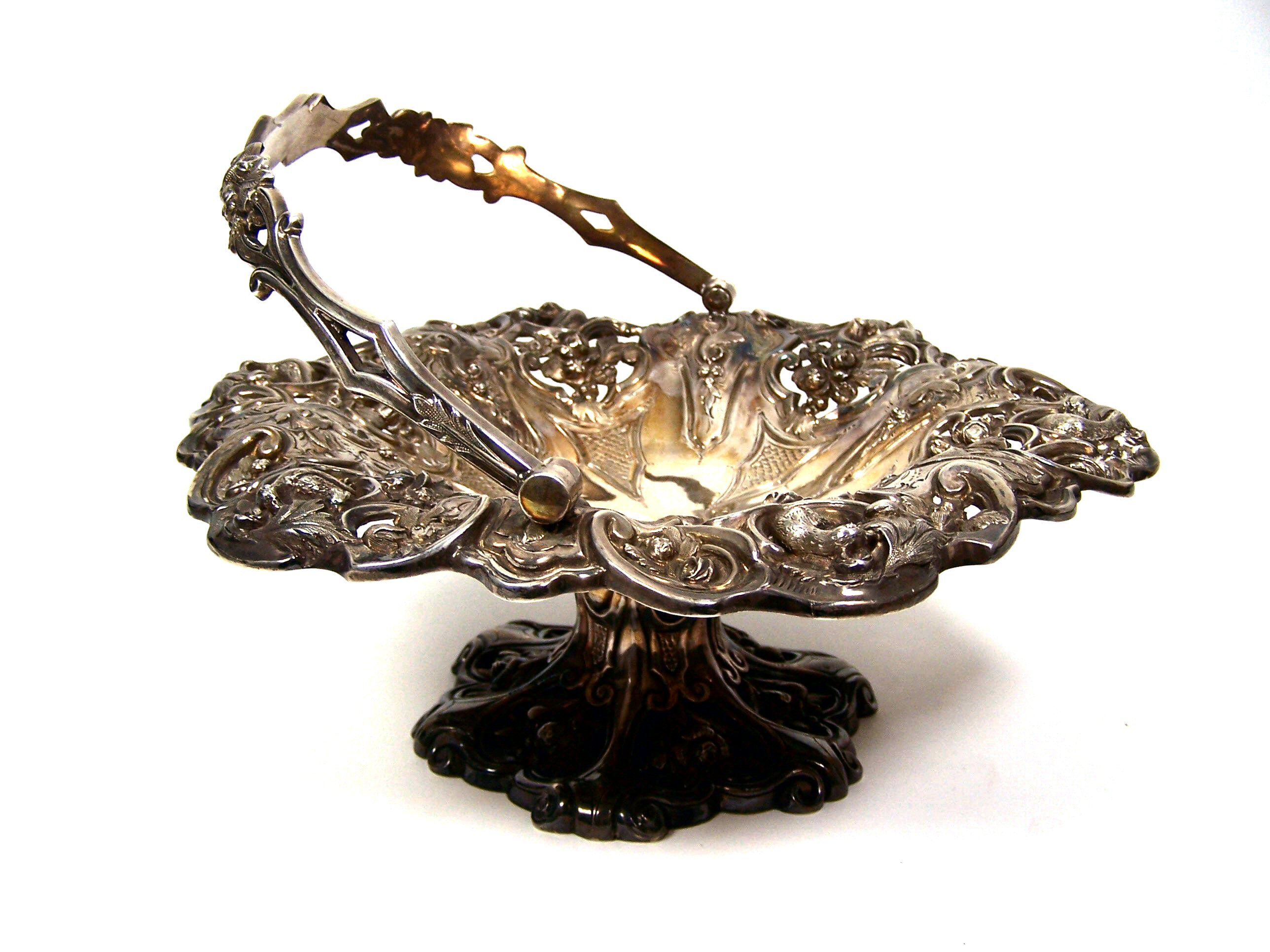 Padley Parkin & Co Sheffield 1854, the shallow dish of shaped circular outline with heavy cast and pierced floral scroll and bird border, with engraved well with script initial R to centre, with hinged swing handle with open scroll work and foliate detail, raised on a short stem and spreading shaped foot rim with pierced floral detail in panels