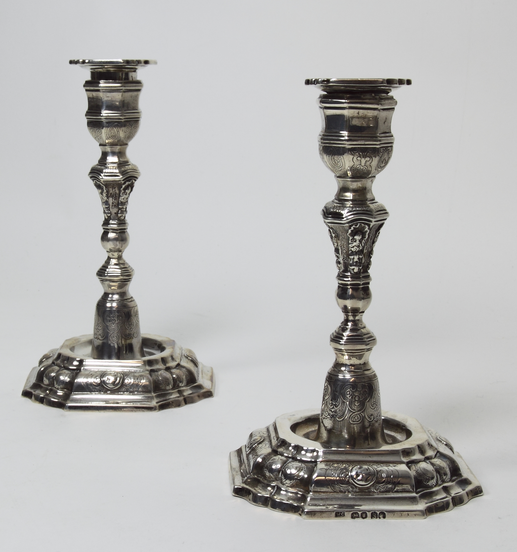 WC, London 1844, the square stepped base with inset corners, the borders with mask motifs and engraved scroll decoration, circular and knopped stem with further engraving, removeable drip trays