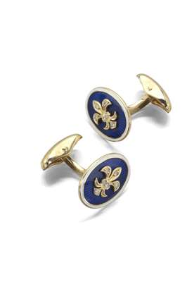 with import marks for Edinburgh 1998, signed and numbered 28/300, each with oval terminal applied to the centre with a round brilliant cut diamond set fleur-de-lys, to a deep blue guilloche enamelled ground, within a white enamelled border, with opposing hinged rounded rectangular terminal, conjoined by a curved bar, with original box and documents