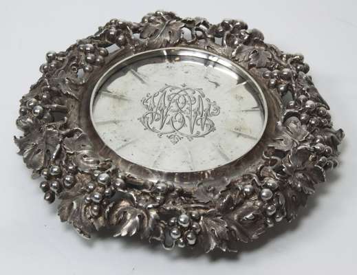 J. S. Hunt, London 1839, of shaped circular outline with finely cast fruiting vine border, the central base with monogram to centre, raised on three silver castors