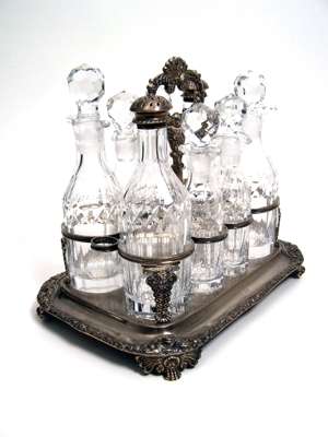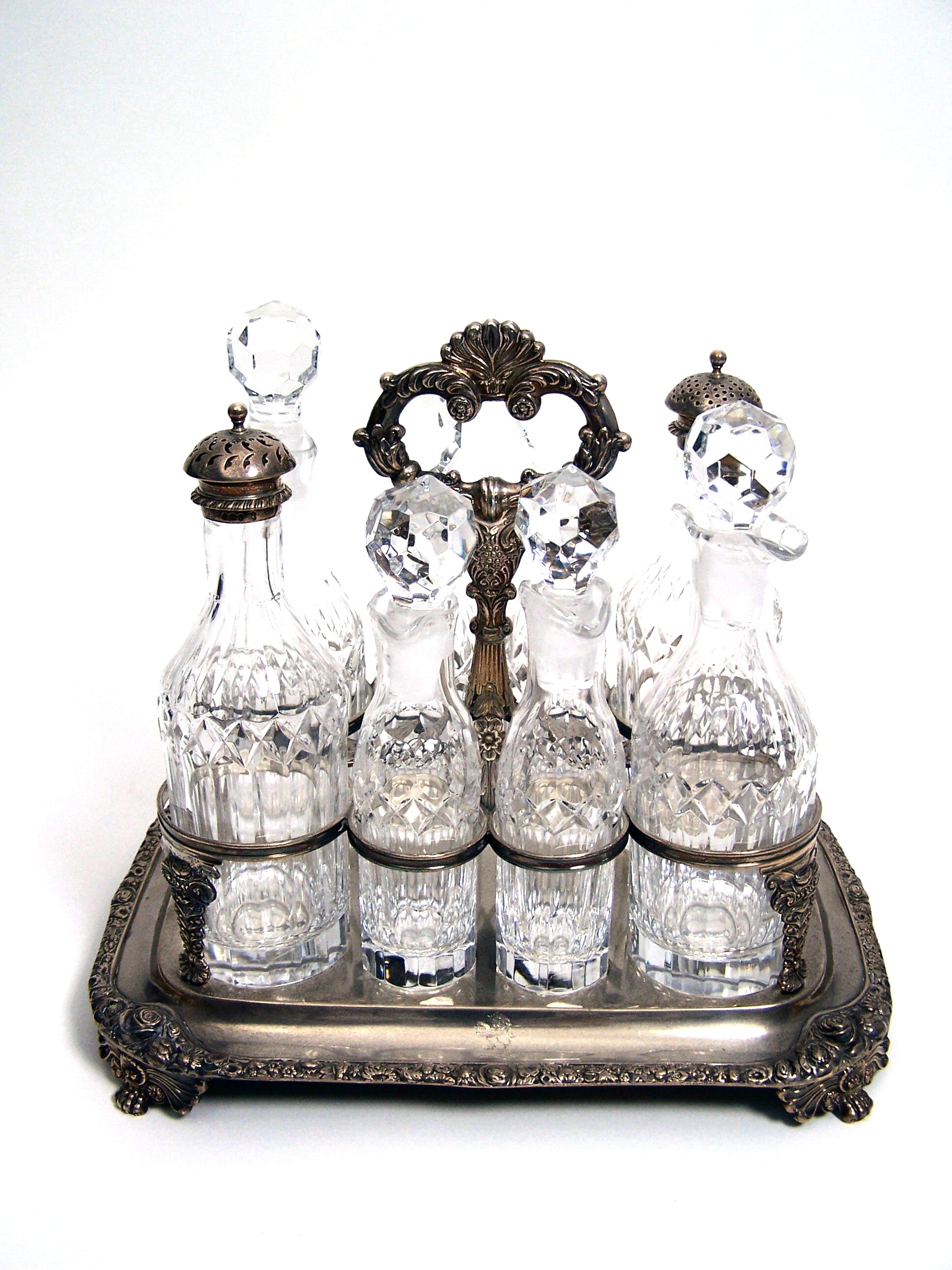 London 1818, the large frame of rectangular outline with flower head border, the raised central section with wire work frame to hold eight bottles with central foliate scroll loop handle, with eight facetted glass bottles with mounted with pierced domed covers